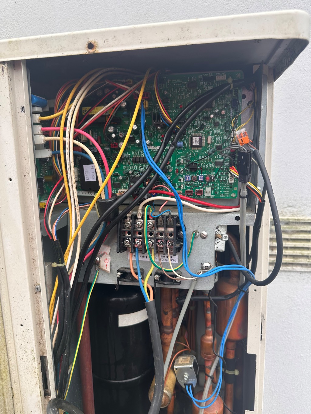 Une fois le diagnostic pré-établi par téléphone, l'examen de l'unité extérieure a confirmé l'absence totale de signal : aucune LED de contrôle n'était allumée sur le circuit de commande.