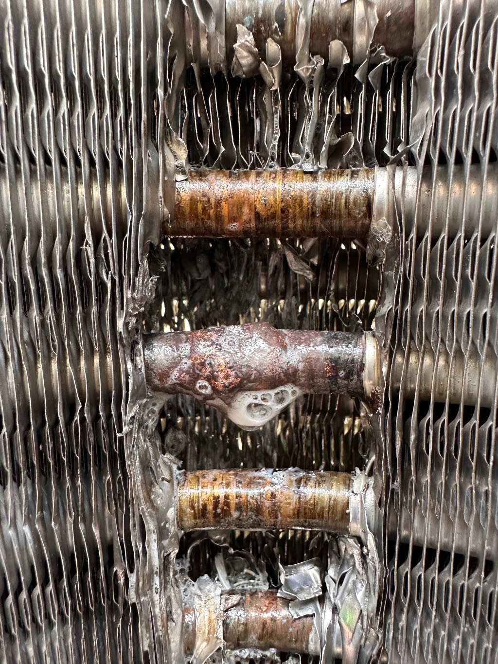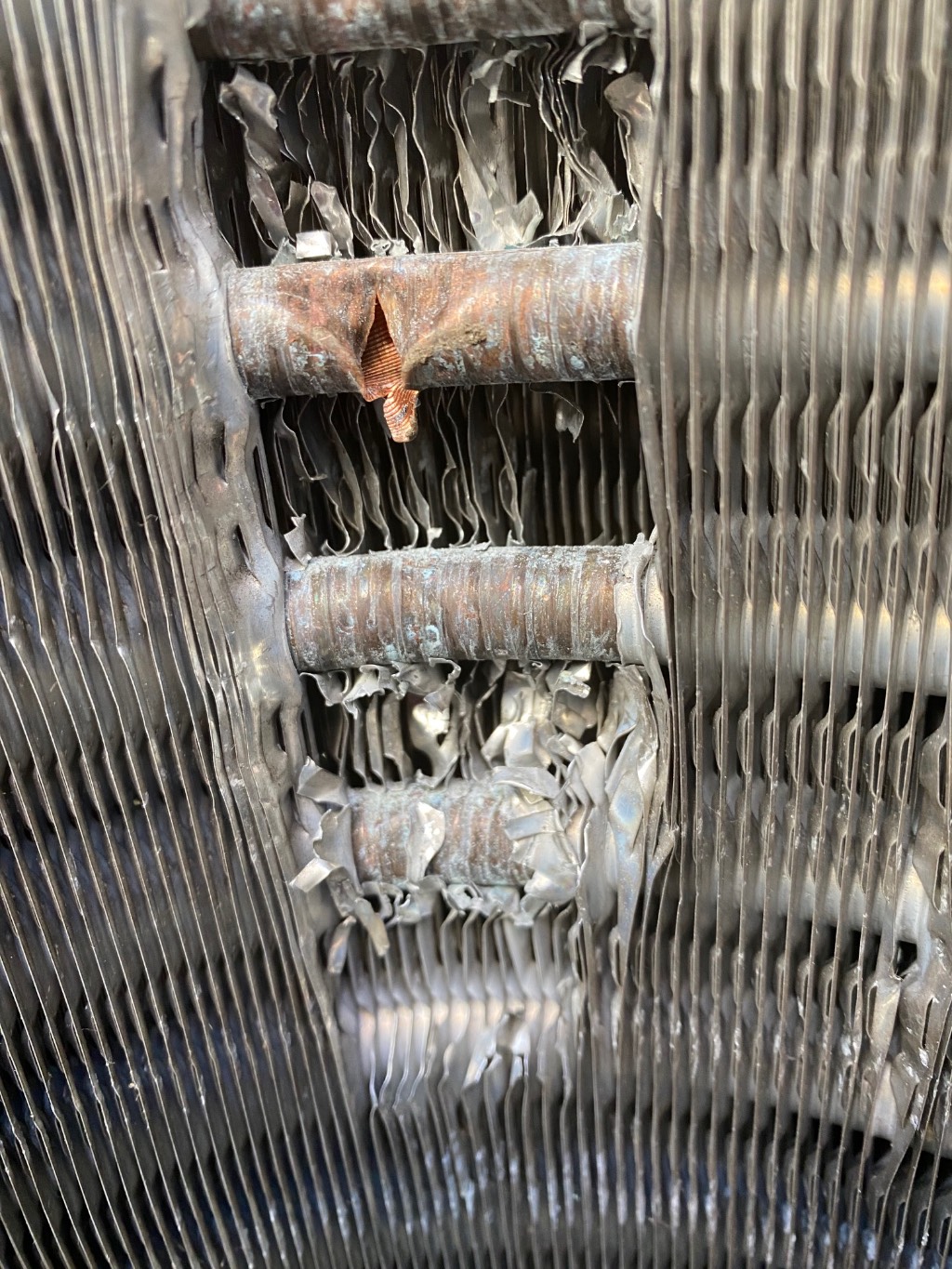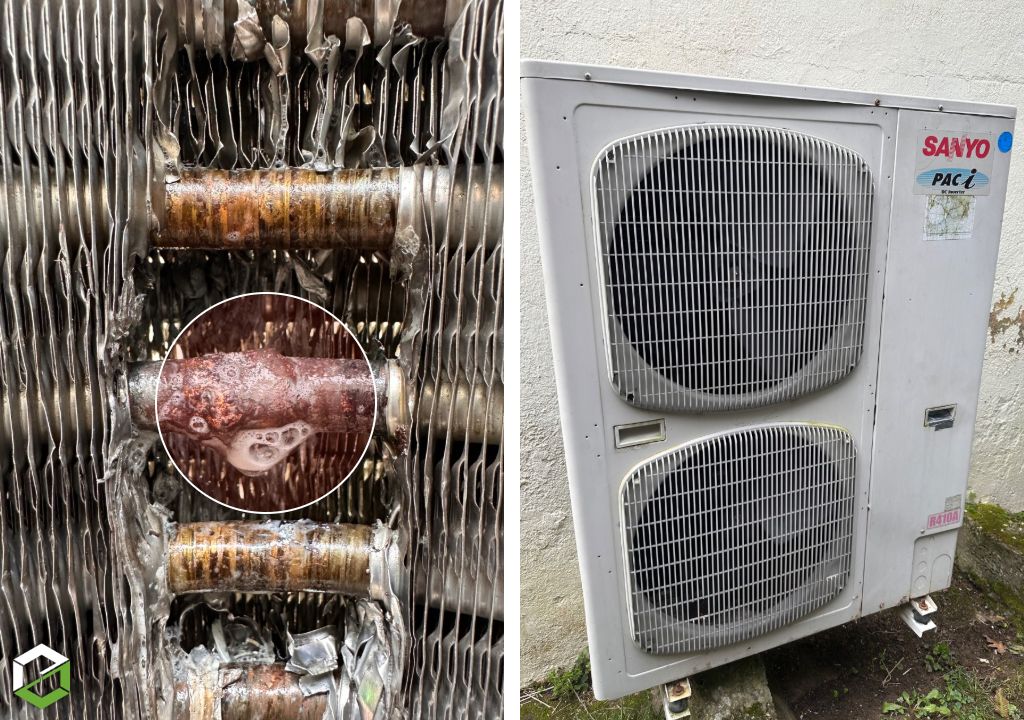 Récemment, nous avons été sollicités pour un cas complexe sur une pompe à chaleur Sanyo. Suite à la rupture d'une hélice moteur, l’échangeur a été percuté, provoquant une fuite totale du fluide frigorigène (R410A).